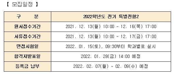2022학년도 전기 특별전형2 일반대학원 신입학 모집요강을 공고하오니 참고하시기 바랍니다.