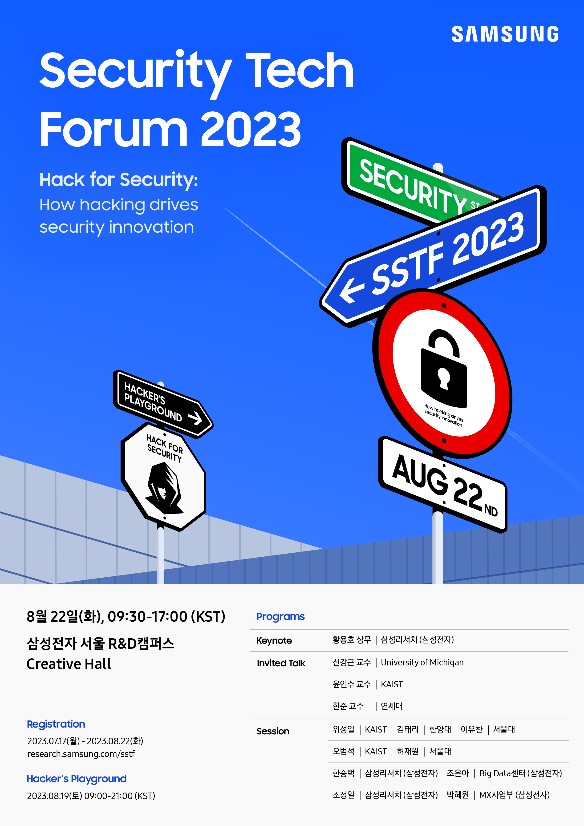 저희 삼성 보안 기술 포럼은 삼성전자가 정보 보안 기술 저변 확대와 인재 양성을 위해 2017년부터 매년 개최하는 행사로써 세계적인 보안 전문가들과 학계·업계 관계자들이 참가합니다.