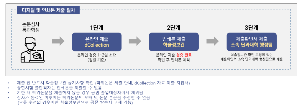 3. 학위논문 ”제출확인서”을 소속 단과대학 행정팀에 제출해야만 졸업대상자에 포함되므로 제출확인서 제출을 안내하여 주시기 바라며, 단과대학 행정팀에서는 졸업사정 시 반드시 제출여부를 확인하여 주시기 바랍니다.