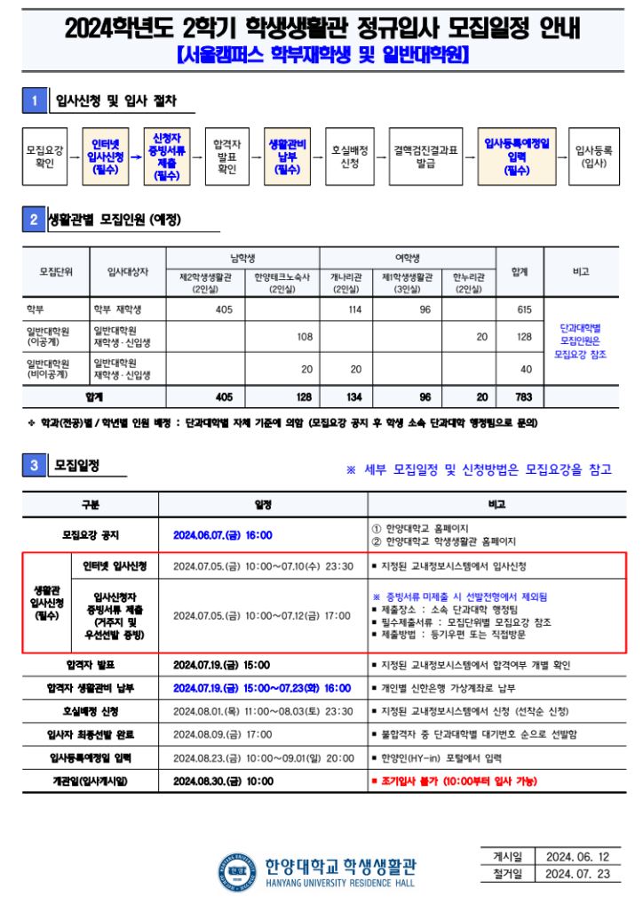 2024학년도 2학기 학생생활관 정규입사자 선발을 다음과 같이 안내하오니 아래 내용 및 첨부파일 확인하시어 기간 내 신청 및 서류제출 바랍니다.