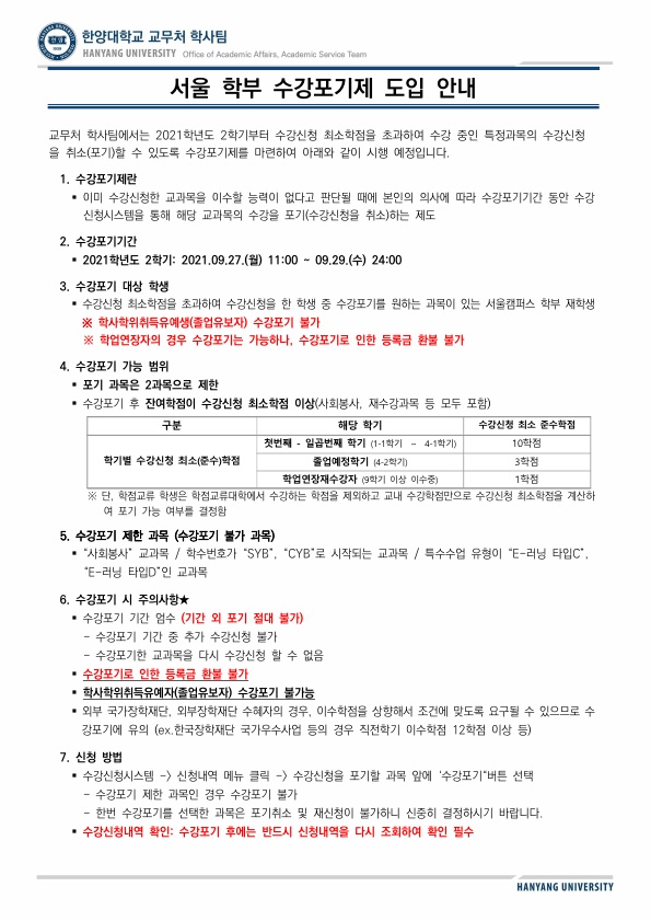 2021학년도 2학기 서울 학부 수강포기제도 도입 안내