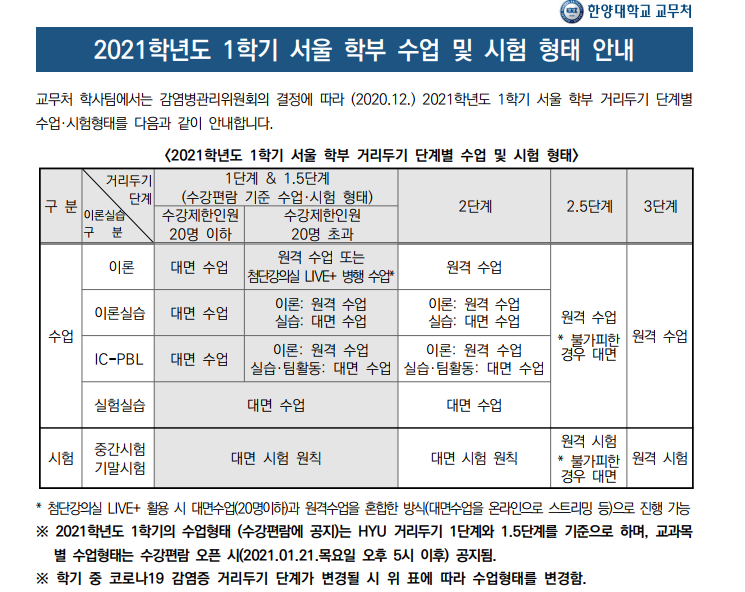 [중요] 2021학년도 1학기 서울 학부 수업 및 시험 형태 안내
