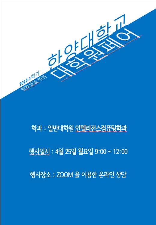 아래와 같이 2022-1학기 인텔리전스컴퓨팅학과 대학원 Fair를 개최하오니 관심 있는 학생들은 많은 참여 바랍니다.