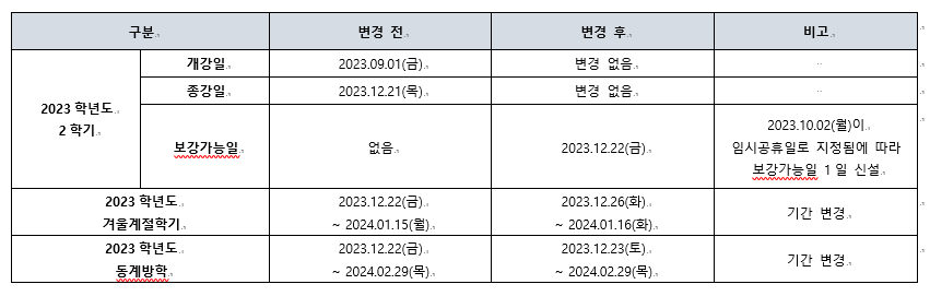 * 10월 2일 임시공휴일 지정에 따라 2023학년도 2학기 학사일정이 다음과 같이 변경되었습니다.