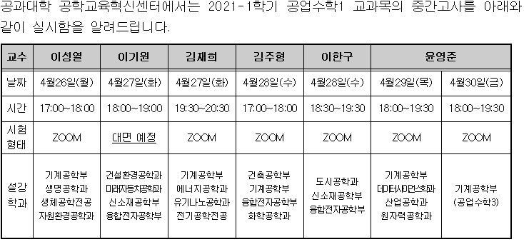 2021-1학기 공업수학1 중간고사 일정 안내