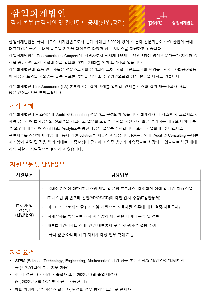 º 지원 방법: 삼일회계법인 홈페이지를 통한 온라인 입사지원서 작성 : https://www.pwc.com/kr/ko/career/risk-assurance.html