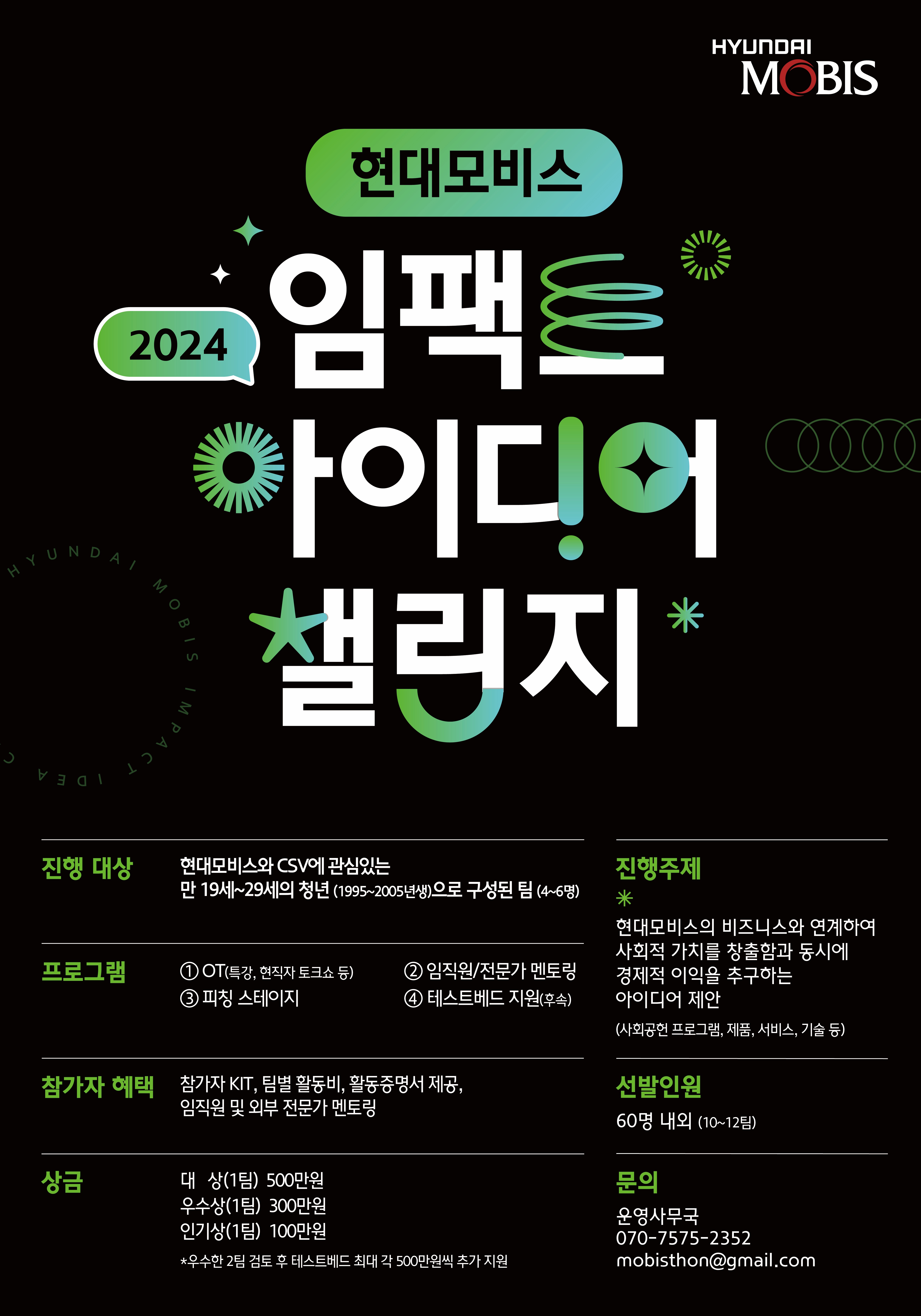 | <2024 현 대모비스 임팩트 아이디어 챌린지>는 현대모비스에서 주최/주관하는 프로그램으로, CSV*에 관심있는지원자들의 창의적인 아이디어를 구체화하고, 실현할 수 있는 프로그램입니다. *CSV(Creating Shared Value) : 공유가치창출. 기업활동 자체로 사회적 가치 창출과 동시에 경제적 수익까지 추구하는 방향 또한 자체적으로 팀을 구성함으로써 지원자들이 능동적으로 프로그램에 참여하고, 현대모비스 내부 임직원 및 외부 전문가의 멘토링, 현직자 토크콘서트, 전문가 강연, 피칭 스테이지, 테스트베드 기회까지 아이디어의 구체화를 위한 다양한 프로그램이 준비되어 있습니다. ※ 공모전 안내 및 참가신청 바로가기 (www.mobisthon.com) ■ 행사개요 1. 행 사 명: 2024년 현대모비스 임팩트 아이디어 챌린지 2. 주최/주관 : 현대모비스 3. 모집 기간 : 2024년 4월 29일 (월) ~ 6월 26일 (수) / 약 7주간 4. 모집대상 : 현대모비스와 CSV에 관심있는 청년 5. 참가자격 : 만 19세 ~ 29세의 청년 (*1995년 - 2005년생) * 지원자 대상으로 지원서 평가 후 선발 예정 6. 접수방법 : 홈페이지 www.mobisthon.com > 참가신청 > 신청서 작성 및 제출 * 참가신청서(홈페이지), 아이디어 기획안, 테스트베드 실행계획안, 신분증사본(출생연도 증빙)필수 제출 7. 참가혜택 : 참가자 KIT, 활동증명서, 임직원 및 외부 전문가 멘토링, 테스트베드 기회 부여 ■ 문의 기타 문의사항은 <2024 현대모비스 임팩트 아이디어 챌린지 운영사무국>으로 연락바랍니다. T. 070-7575-2353 E. mobisthon@gmail.com |