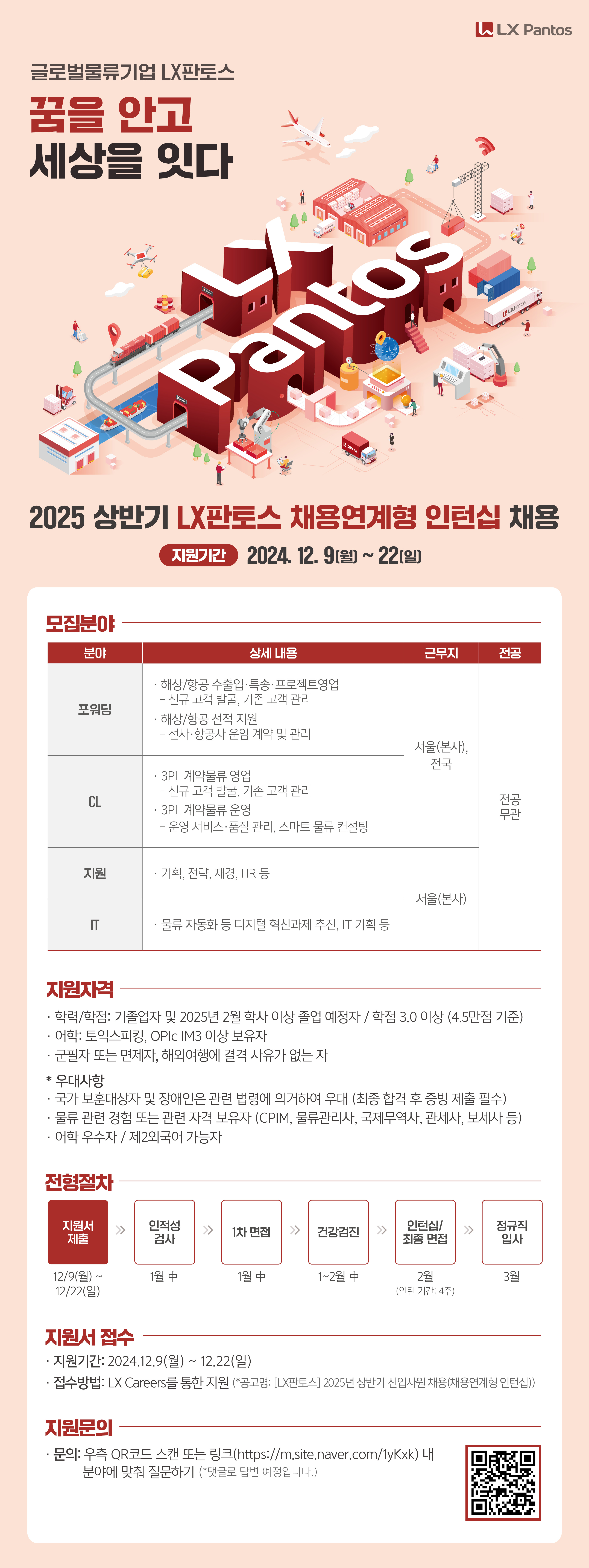 LX판토스에서 2025 상반기 채용연계형 인턴십을 모집하고 있으니 많은 관심과 지원 부탁드립니다.