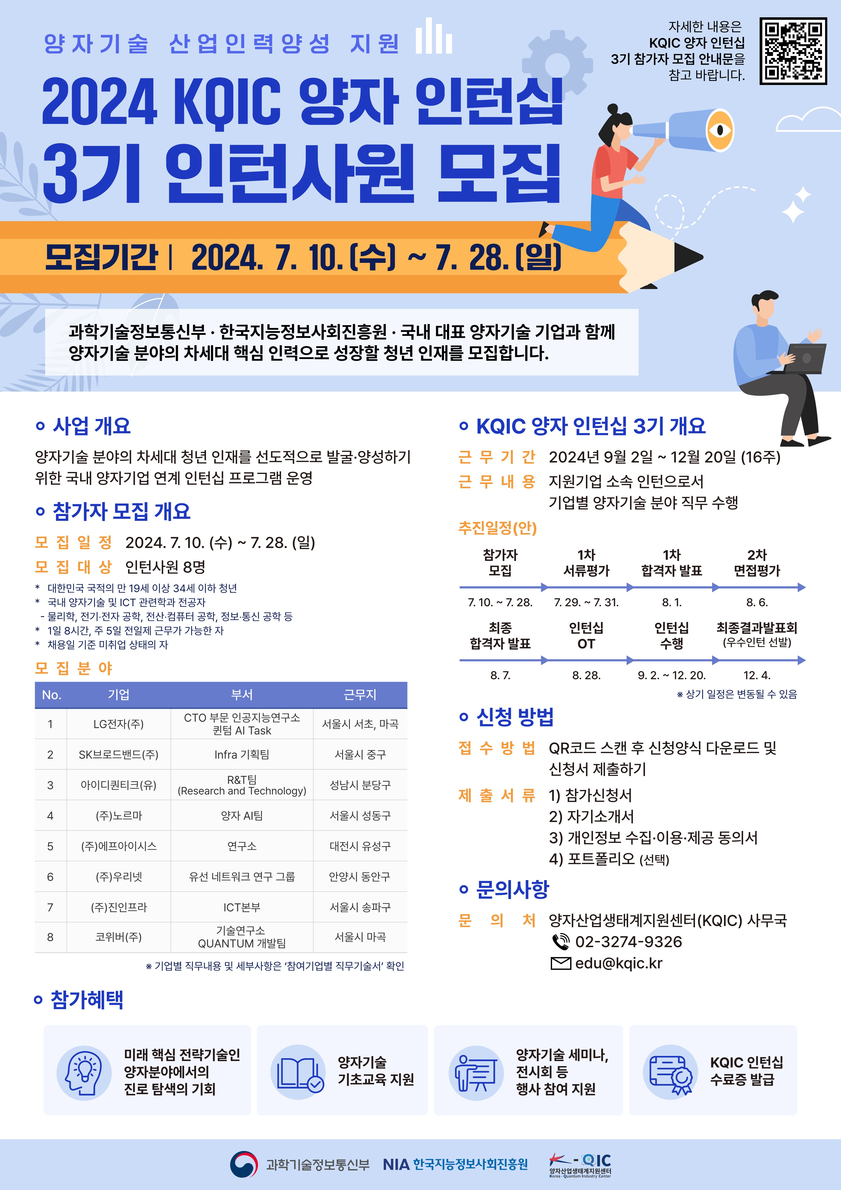 과학기술정보통신부와 한국지능정보사회진흥원 주관 ‘양자기술 산업인력양성 지원’ 사업의 일환으로 ‘KQIC 양자 인턴십 3기' 참가자(인턴사원)를 모집합니다.