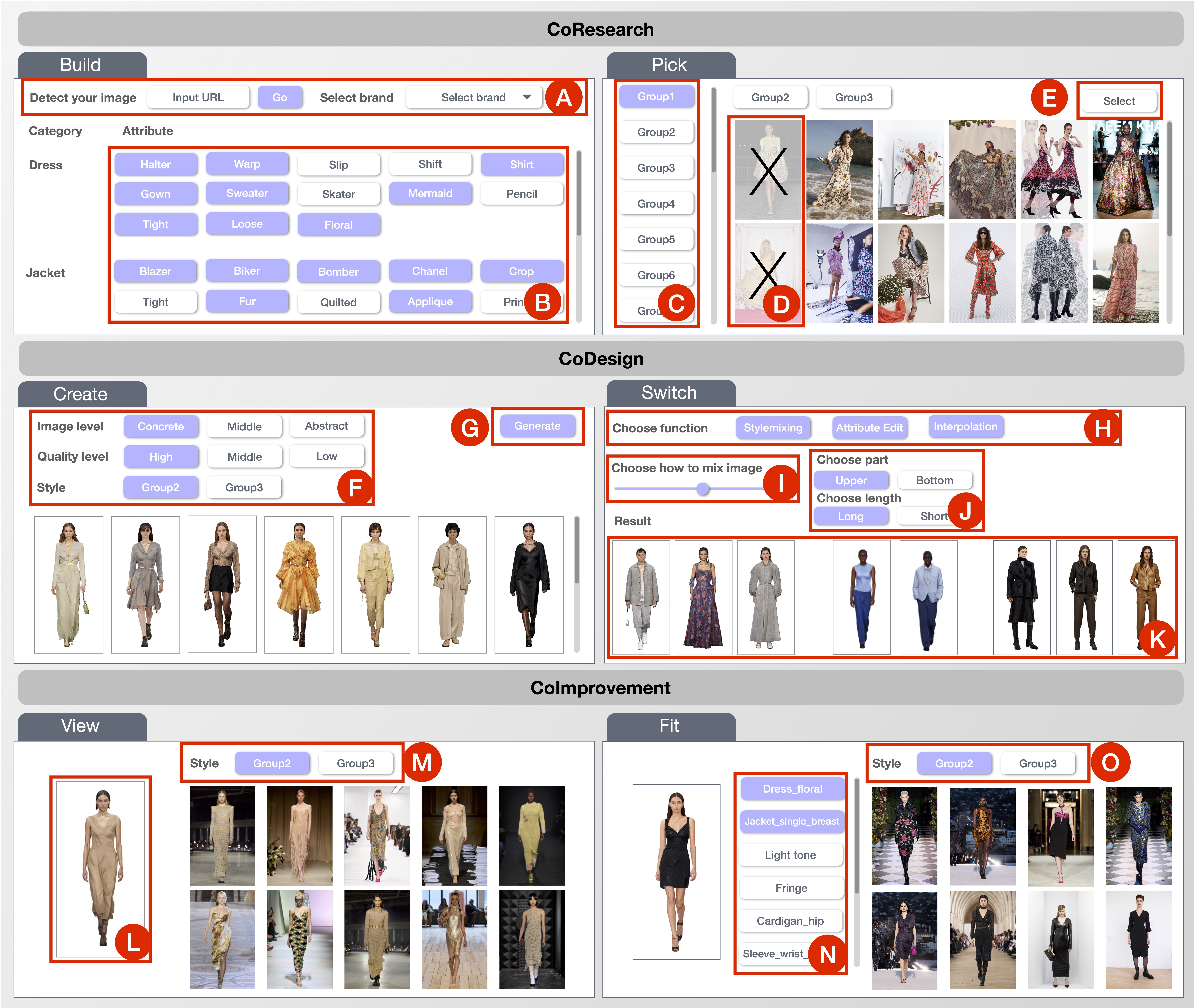 그림1. 패션 디자이너의 창의력 프로세스를 지원하는 인공지능 시스템 CoCoStyle의 인터페이스. (A) 사용자는 선호하는 스타일의 이미지를 업로드 하거나 럭셔리 브랜드 중 하나를 선택할 수 있다. (B) 사용자는 선택된 패션 요소를 직접 선택하고 삭제할 수 있다. (C) 사용자는 스타일을 탐색하고, (D) 마음에 들지 않는 이미지는 삭제할 수 있다. (E) 이미지 삭제 후 남은 이미지가 만족스러운 경우 선택 버튼을 클릭 한다. (F) 사용자는 StyleGAN과 관련된 파라미터를 선택한다. (G) 생성버튼을 클릭시 StyleGAN으로 부터 생성된 이미지가 화면에 나타난다. (H) 사용자는 StyleGAN에서 추가로 제공하는 3가지 기능중 하나를 선택하여, (I, J) 슬라이더를 조정하거나 상단/하단 및 짧음/긴 버튼을 선택하여 이미지를 StyleGAN으로 부터 생성된 이미지를 조정할 수 있다. (K) 사용자는 수정된 이미지를 확인한다. (L) 사용자는 이미지를 업로드 하고 (M) 스타일을 선택하면, 이미지 추천을 받게 된다. (N) 사용자가 패션 요소를 선택하면, 이를 기반으로 이미지 추천을 받게 된다.