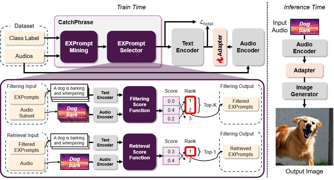 CatchPhrase는 이러한 한계를 극복하기 위해 Enriched Cross-modal Prompts(EXPrompts)개념을 제안합니다. 기존의 단순 라벨 대신, 대형 언어모델과 오디오 캡셔닝 모델을 이용해 청각적·시각적 단서를 통합한 서술형 프롬프트를 생성합니다. 이후 EXPrompt Selector모듈이 오디오-프롬프트 간 유사도를 기반으로 가장 적합한 설명을 필터링하고, 학습시에 검색을 통해 최종적으로 입력 오디오에 가장 적합한EXPrompt 하나를 선택하여서 클래스 및 인스턴스 수준의 의미 불일치를 최소화합니다. 최종적으로 선택된EXPrompt는 이미지 생성 모델의 조건으로 활용되며 학습 시EXPrompt는 infoNCE 손실함수에 활용되며, 이는 오디오 입력을 이미지 생성 과정에 효과적으로 연결합니다. 이 연구는 오디오로부터 이미지를 생성시 발생하는 언어적 불일치와 청각적 착각을 체계적으로 다룬 첫 사례로, 다중모달 생성의 새로운 가능성을 제시합니다.