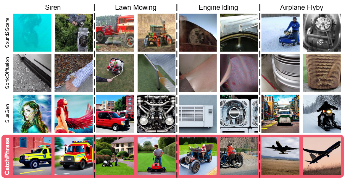 CatchPhrase는ESC-50, UrbanSound8K, VGGSound 등 다양한 오디오 데이터셋에서 기존 템플릿 기반 방식 대비 높은Audio-Image Similarity(AIS)와FID 개선을 달성했으며 생성된 이미지를 통해서도 제안하는 방법의 효과성을 보였습니다. 특히 “engine idling”, “gunshot” 등 맥락 의존적 사운드에서 더 사실적이고 일관된 이미지를 생성했습니다. 이는 단순 클래스 레이블 기반 접근을 넘어, 의미적으로 풍부한 프롬프트 설계로 언어적 불일치와 청각적 착각을 완화시킴으로써 오디오-이미지 정렬을 근본적으로 향상시킬 수 있음을 입증합니다.