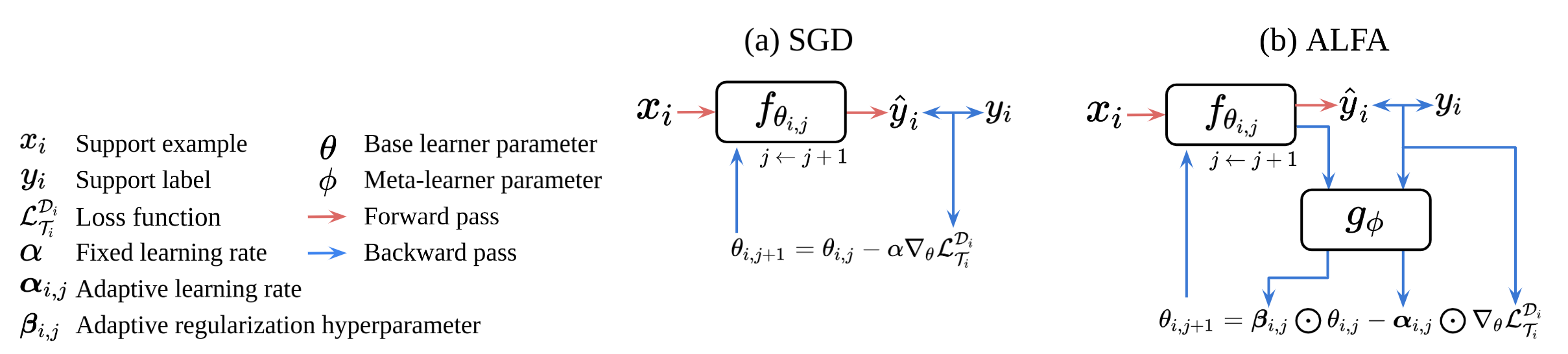 본 연구는 few-shot 학습 문제를 해결하기 위해 메타 학습(meta-learning), 특히 최적화 기반 메타 학습을 사용한다. 기존 연구들은 주로 좋은 가중치 초기화(parameter initialization)를 학습하는 데 중점을 두었으나, 본 연구는 작업 적응을 위한 최적화 과정의 중요성에 주목했다. 이를 위해, 본 연구는 최적화 과정에서 적응형 학습 하이퍼파라미터(Adaptive Learning of Hyperparameters for Fast Adaptation, ALFA)와 적응형 손실함수(Meta-Learning with Task-Adaptive Loss Function, MeTAL)를 제안한다. ALFA는 학습률과 가중치 감소 계수를 동적으로 생성하여, 임의의 초기화에서 시작하더라도 각 작업에 효과적으로 적응할 수 있게 한다. MeTAL은 학습할 주어진 작업에 적합한 손실함수 자체를 동적으로 생성하여, 각 작업에 효과적으로 적응 및 학습할 수 있게 한다. 초기값 학습에 집중한 기존 연구들과 달리 학습 파라미터 및 손실함수로 이루어진 최적화 과정 자체를 동적으로 생성함으로써 월등한 few-shot 학습 능력을 이룬 획기적인 방법론이다.