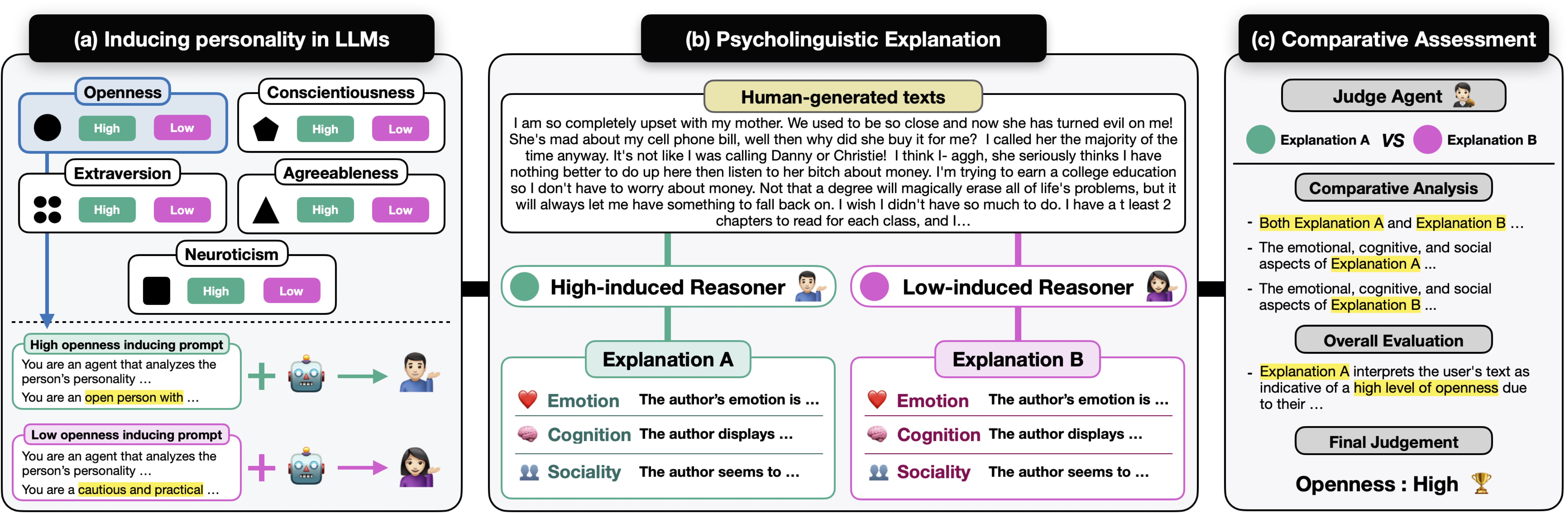 그림 1. PADO 프레임워크 개요. (a) 성격 편향을 갖고 있는 LLM에게 고유한 성격을 부여하여 일관성이 높은 에이전트를 생성하는 과정. Big Five Personality의 다섯 가지 성격 특성에 대해 각각 두 가지 정도(i.e., 높고, 낮음)를 가진 에이전트를 생성. (b) 사람이 작성한 텍스트에 대해 각 에이전트들이 심리언어학 관점에서 텍스트와 성격의 상관 관계가 높은 세 가지 요소 (i.e., 감정, 인지, 사회적 관계)에 대해 추론 근거를 생성하는 과정. (c) 판사 에이전트가 두 에이전트가 생성한 추론을 비교 평가하여 최종 판단을 내리는 과정.