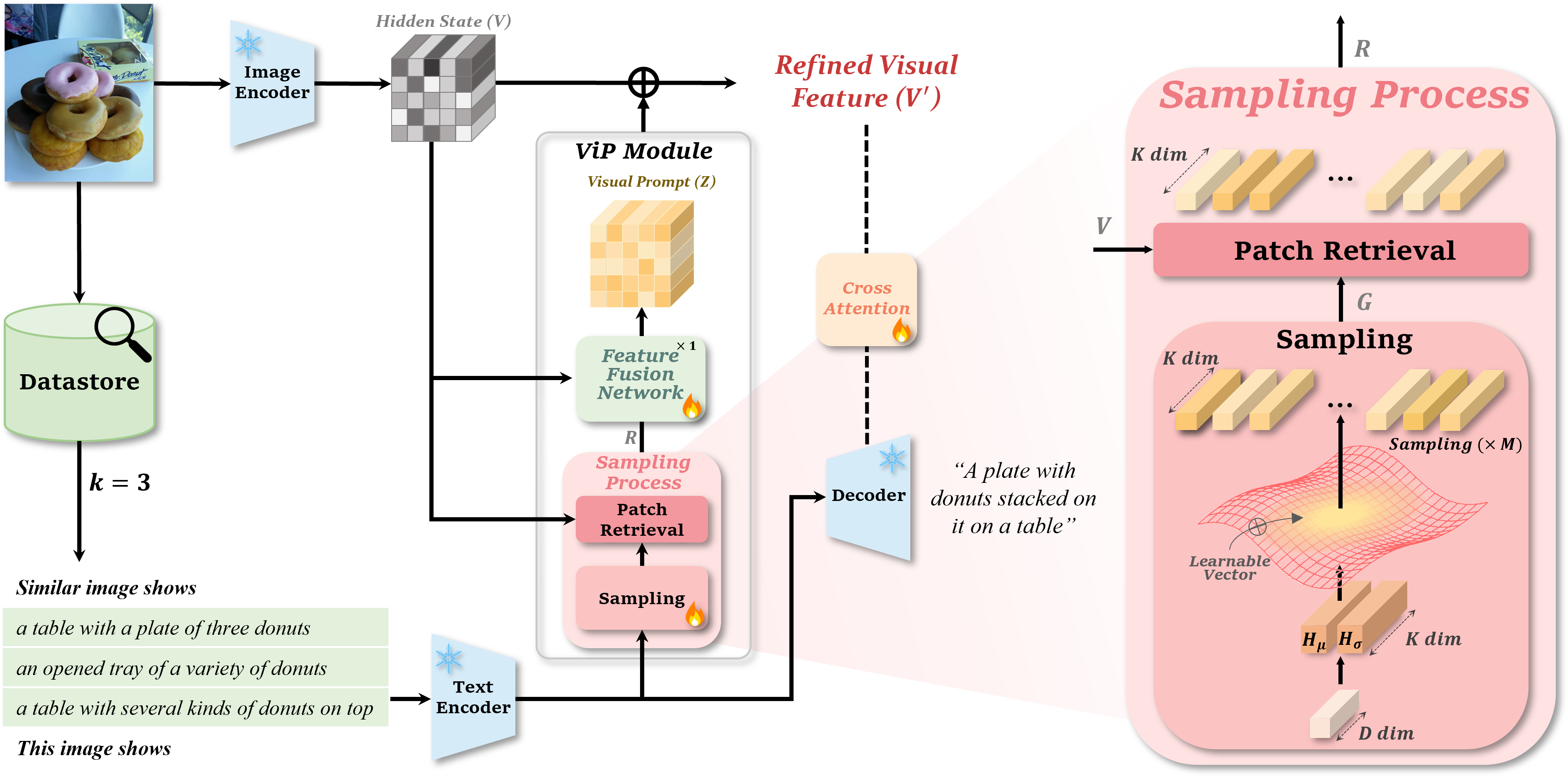 본 연구 ViPCap은 검색된 텍스트를 활용하여 시각 프롬프트(Visual Prompt)를 생성하는 새로운 경량 이미지 캡셔닝 모델을 제안한다. ViPCap은 검색된 텍스트를 CLIP 임베딩 공간에 매핑하고, 이를 랜덤 가우시안 분포(Randomized Gaussian Distribution) 기반의 샘플링 기법을 활용하여 다양한 의미적 특징을 추출한다. 이후, 추출된 의미적 특징을 이미지 패치와 정렬하여 시각 프롬프트로 변환함으로써, 기존의 retrieval 기반 방식보다 더욱 시각 정보가 강화된 캡셔닝을 가능하게 한다. 특히, 본 연구는 검색된 텍스트에 내재되어 있는 시각 정보가 이미지의 로컬 정보와 결합하여 향상된 캡셔닝으로 다양한 데이터셋(COCO, Flickr30k, NoCaps)에서 뛰어난 성능을 보인다.
