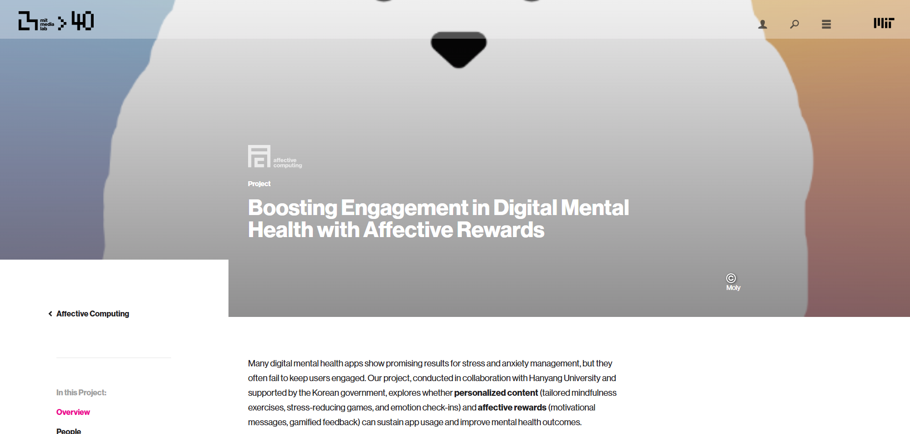 국내 연구진이 정부 지원으로 구축한 디지털 정신건강 플랫폼이 세계적인 연구기관인 MIT 미디어랩(MIT Media Lab)과의 공동 연구로 확장되고 있다. (https://www.media.mit.edu/projects/enhanced-mental-health-engagement/overview/) 김형숙 교수 연구팀은 80만 건에 달하는 멀티모달 헬스 데이터를 기반으로 구축한 정신건강 플랫폼 MIT 미디어랩(MIT Media Lab) 산하 어펙티브컴퓨팅 그룹(Affective Computing Group)과 함께 정서적 보상 기반의 맞춤형 AI 개발에 나서며 새로운 전환점을 맞았다.
