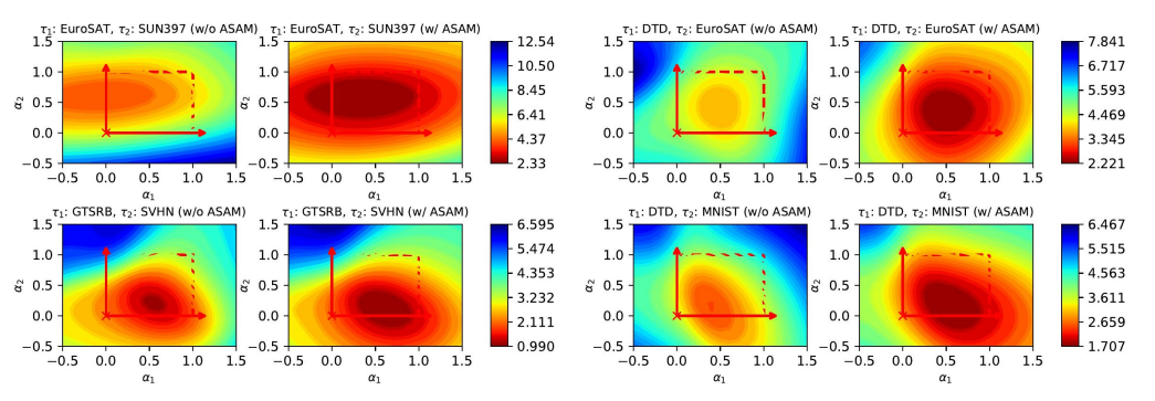 본 연구는 모델 병합 시 파라미터 간 간섭을 완화하고 각 작업의 성능을 유지하기 위한 새로운 미세 조정 방식인 SAFT(Sharpness-Aware Fine-Tuning)를 제안한다. 이는 Sharpness-Aware Minimization(SAM) 기법에 기반해 평탄한 최소값 영역(flat minima)을 찾도록 유도함으로써 병합 시 발생할 수 있는 파라미터 변동에 덜 민감한 모델을 생성한다. 이로 인해 병합 모델의 성능 저하를 줄이고, 작업 간 파라미터 독립성(weight disentanglement)을 개선하여 멀티태스크 학습의 효율성과 확장성을 높인다.