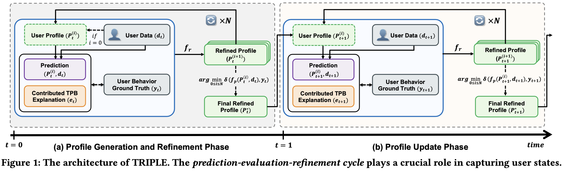 본 연구에서 제안하는 TRIPLE (TPB-dRIven Profiling with LLM rEfinement)은 행동계획이론(Theory of Planned Behavior, TPB)의 잠재 변수 구조를 LLM 기반 사용자 프로파일링에 통합한 동적 프로파일링 프레임워크입니다. TRIPLE은 LLM을 활용해 사용자의 텍스트로부터 태도(Attitude), 주관적 규범(Subjective Norm), 지각된 행동 통제(Perceived Behavioral Control)를 추출하여 초기 프로파일을 구성하고, 이후 예측–평가–정제(predict–evaluate–refine)주기를 반복하여 예측 오류를 최소화하는 방향으로 프로파일을 지속적으로 개선합니다. 이 과정에서 TRIPLE은 단순히 데이터를 누적하거나 전체 프로파일을 재생성하는 기존 방식보다, 사용자의 내면적 상태 변화를 더 정확하게 포착할 수 있습니다. 특히, 사회심리학적 이론을 LLM 기반 프로파일링에 최초로 통합한 연구로서, 추가 학습 없이 다양한 오픈소스 LLM 환경에서 적용 가능한 보편적 프레임워크를 제시합니다.