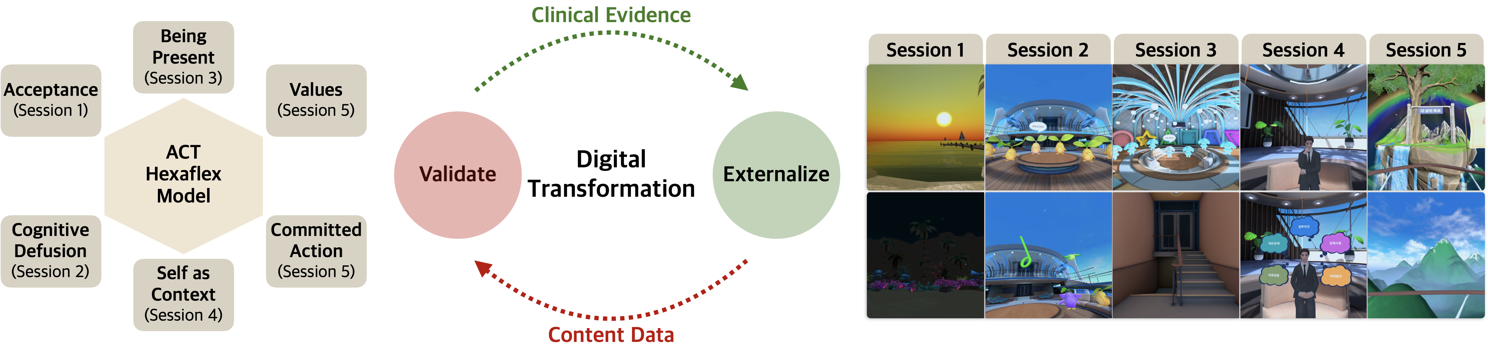 그림1. VR-ACT의 개요로, ACT의 핵심 원리를 가상 환경으로 외재화하여 디지털 전환한 과정을 보여준다. 참여자는 각 세션에서 제시된 사용자 과제를 전경(첫 번째 행)에서 수행하며, 동시에 사실적인 배경 장면(두 번째 행)은 몰입감을 강화한다. 이러한 전환 과정은 임상적 근거에 기반하여 ACT 원리를 VR 콘텐츠로 구현한 것이며, VR-ACT를 통해 수집된 사용자 상호작용 데이터는 이러한 핵심 원리의 타당성을 검증하는 데 활용된다.